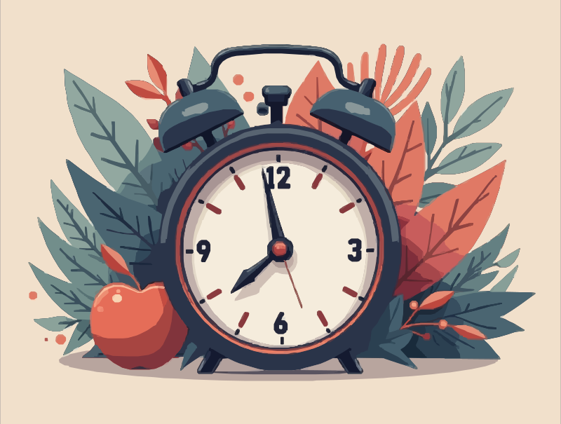 A classic alarm clock surrounded by vibrant autumn leaves and a red apple, blending warm colors with a vintage style.