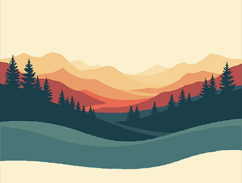 Silhouetted pine trees frame rolling hills and distant mountains bathed in warm orange and yellow hues. The scene combines earthy tones with a serene, minimalist style.